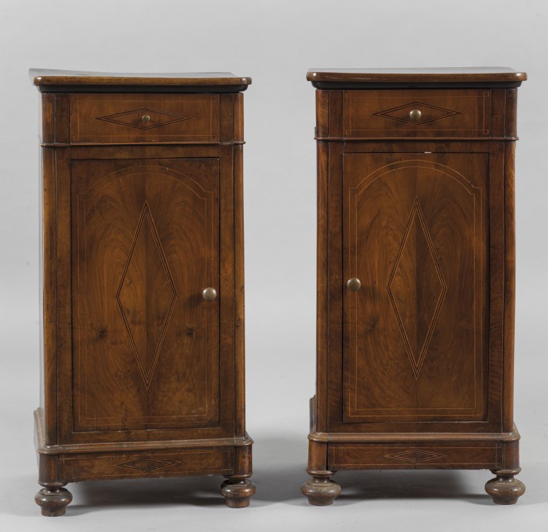 Coppia di comodini in noce, ad un cassetto ed uno sportello, montanti arrotondati, Genova I metà sec.XIX