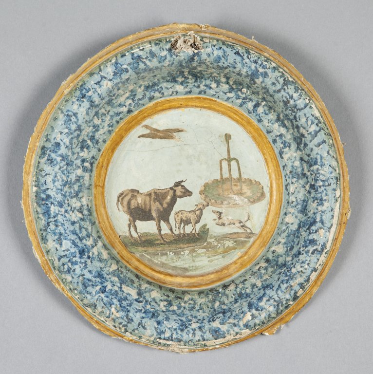Quattro cornicette in papier mache, decorate all'interno con figurine in arte povera, inizi sec. XIX