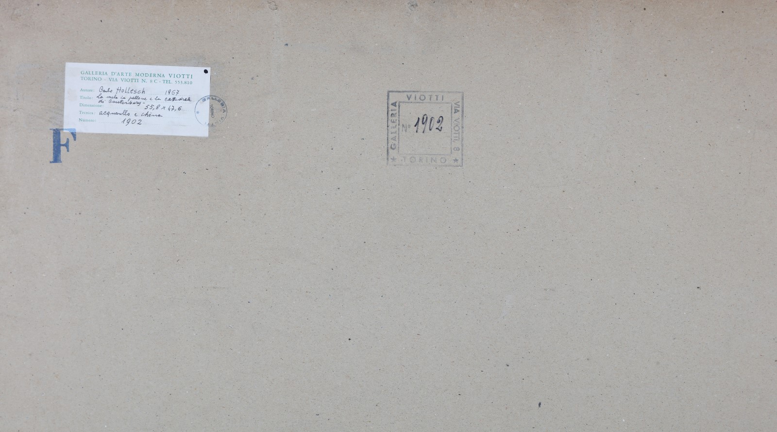HOLLESCH CARLO (1926 - 1977) La mela in pallone e la cattedrale. 1967. Tecnica mista su carta. Cm 55,80 x 47,60. Firma e anno in basso a destra. Al retro Cartiglio descrittivo con timbro a cura della Galleria d'Arte Moderna Viotti, Torino. Cornice presente
