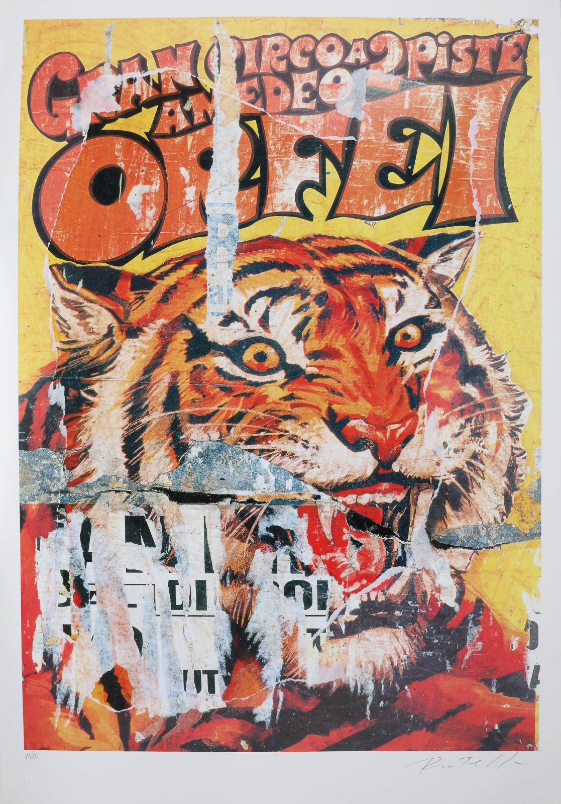 ROTELLA MIMMO (1918 - 2006) Gran circo a 2 piste - Amedeo Orfei. Litodecollage. Cm 70,00 x 100,00. 13/125. Tiratura e firma a matita in basso. Timbro a secco Fondazione Mimmo Rotella, Milano in basso a sinistra. Pubblicazione: Mimmo Rotella - Multiples décollages, Silvana Editoriale, 2005, pag. 101.