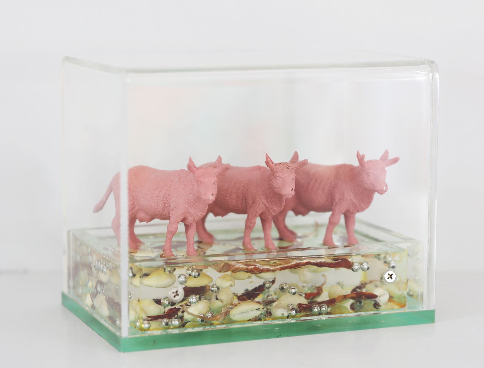 SWEETLOVE WILLIAM (n. 1949) Three cloned pink cows. 2006. Scultura. Cm 12,00 x 15,00 x 19,00. Resina epossidica, plastica. Autentica dell'artista su fotografia. entro teca di plexiglass.