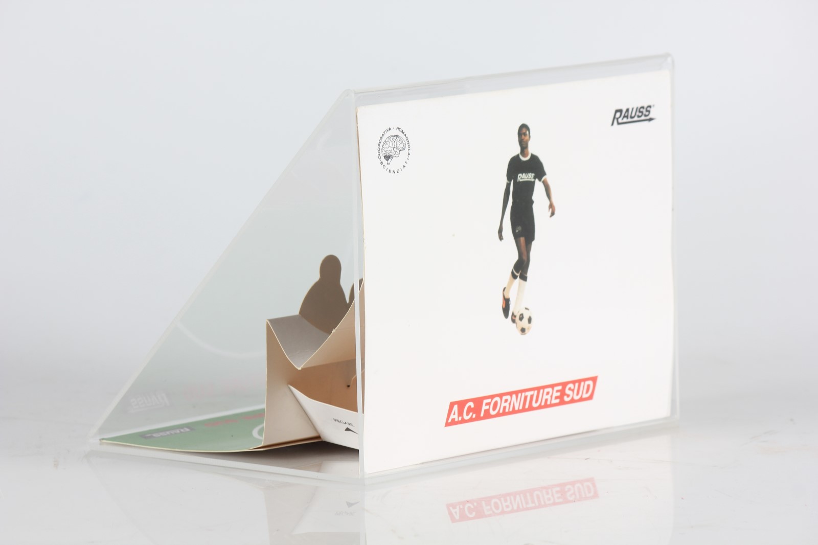 CATTELAN MAURIZIO (n. 1960) A.C. Forniture Sud. Torneo liberi e forti 1990 - 1991. Cartoncino e plexiglass. Cm 23,00 x 18,00 x 18,00. Firma e titolo alla base. Il presente espositore, stampato in mille copie, è parte dell'operazione Sponsor di Maurizio Cattelan.