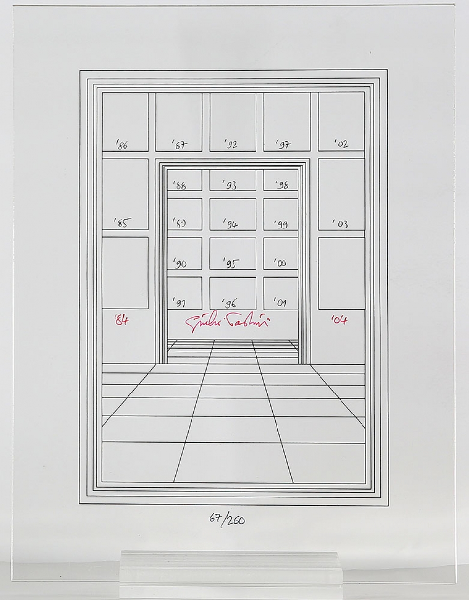 GIULIO PAOLINI, 1940, ‘84 - ‘04, 2004, Multiplo in plexiglass, cm. 40 x 30 x 1, Firmato e datato, Opera n. 67/260, Edizioni Marco Noire, Opera eseguita per i venti anni , del Castello di Rivoli, L’ opera è accompagnata dalla custudia, documentazione e piedistallo originale, Prov. Collezione Privata