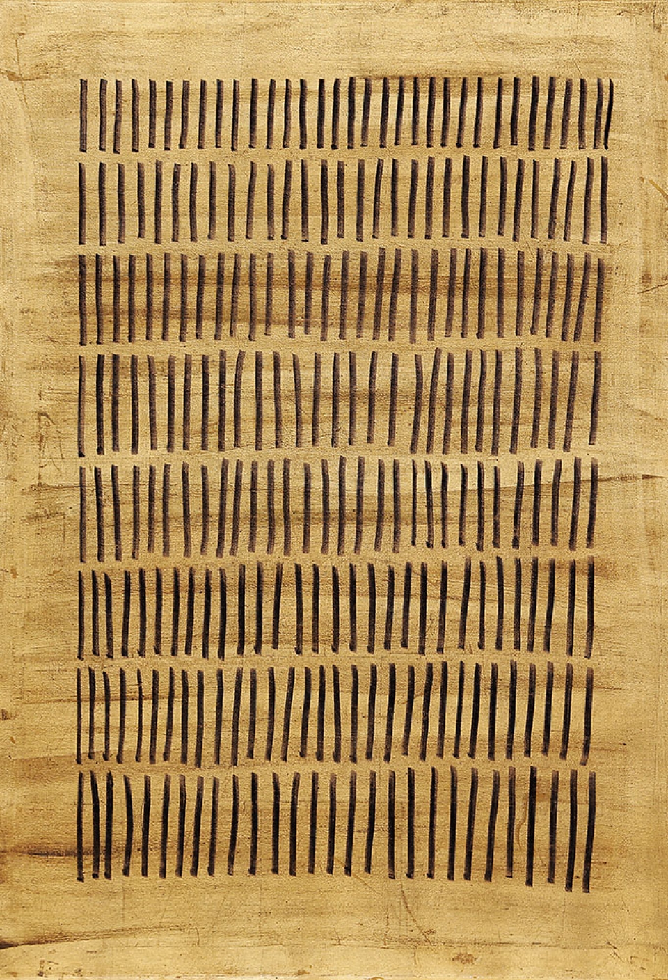 ARTURO VERMI, 1928 - 1988, Stanze della chiesa, 1973, Pennarello e foglia d’oro su tela, cm. 100 x 70, Firmato e datato sul retro, Opera registrata presso l’Archivio Vermi, Prov. Collezione Privata
