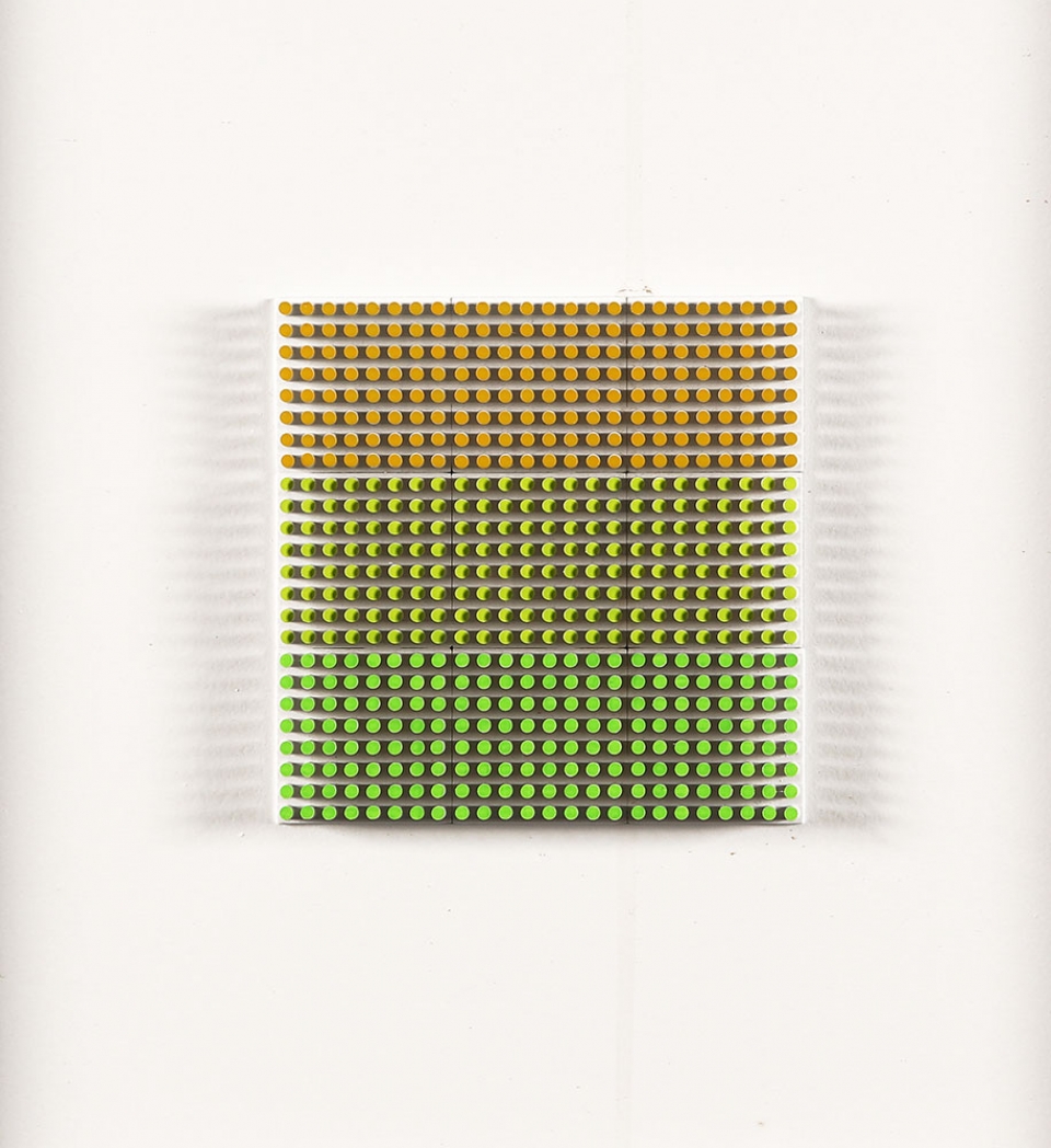 FRANCO COSTALONGA, 1933, Operazione QSDFG, anni ‘70, Cilindri in rilievo su tavola, cm. 32 x 32, Firmato sul retro, Prov. Collezione Privata