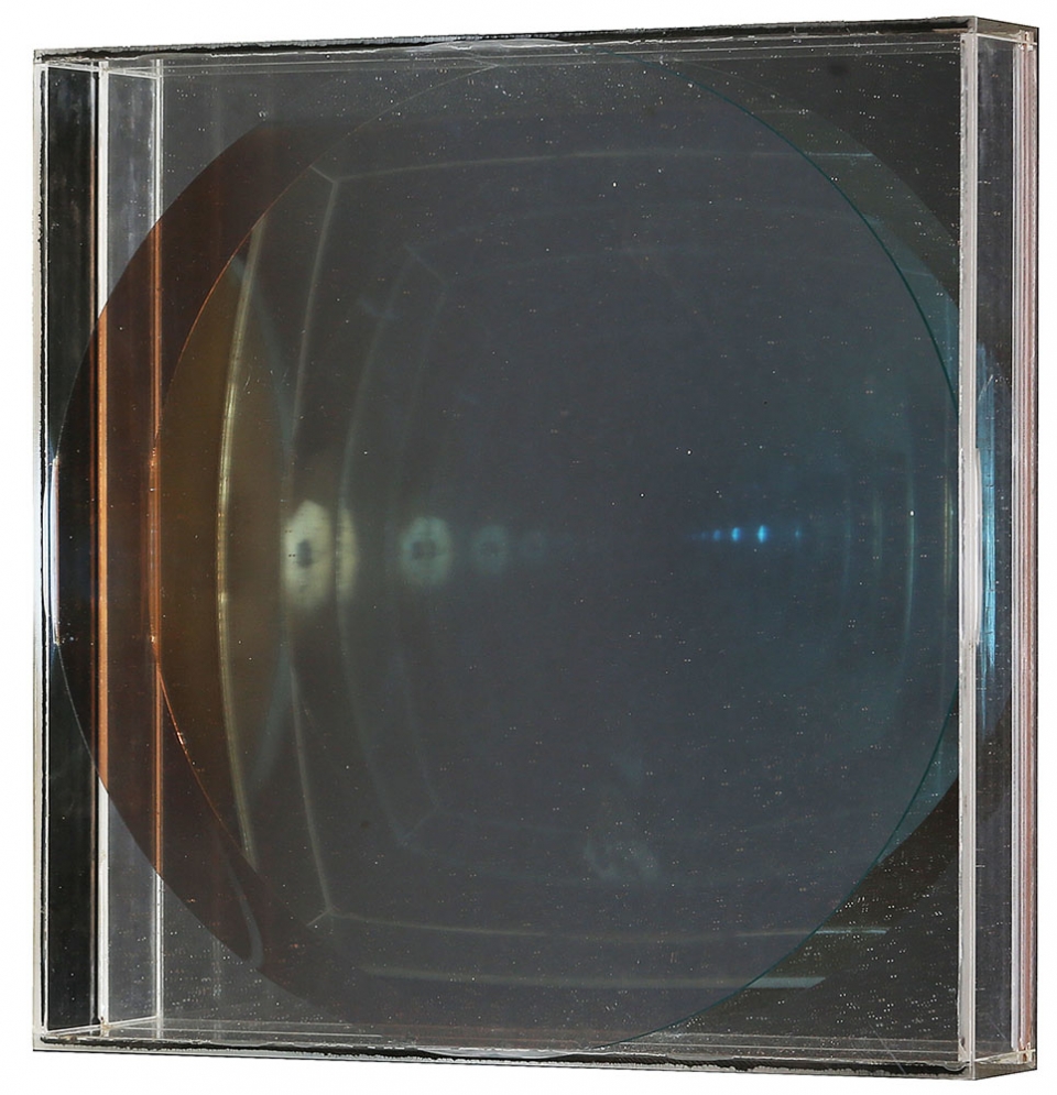 ADOLF LUTHER, 1912 - 1990, Hohlspiegelobjekt, 1969, Assemblaggio, lente di vetro su specchio in box di plexiglass, cm. 39 x 39 x 7, Firmato e datato sul retro, Etichetta Villa Grisebach Berlino sul retro, Prov. Collezione Privata