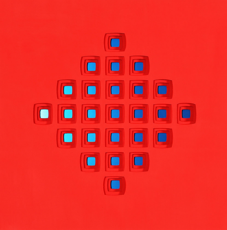 VANNA NICOLOTTI, 1929, Mandalo rosso, 2011, Tela integliata e dipinta e metallo anodizzato, cm. 60 x 60, Firmato sul retro, Etichetta Studio dell’artista sul retro, Prov. Collezione Privata