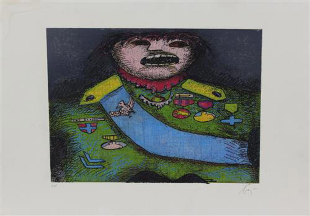 Enrico Baj, Senza titolo, incisione e serigrafia materica su carta, cm. 53x74 (lastra cm. 36x48,5), es. 65/75, firmata in basso a destra, certificazione su fotografia della Galleria Arte Spiga di Milano, l'opera presenta una macchia di umidità nell'angolo in alto a sinistra e qualche piccola macchia di umidità ai margini, senza cornice