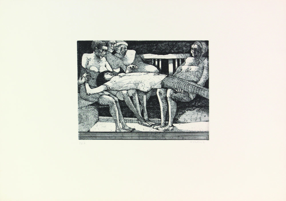 Karl Plattner, La ragazza svenuta, 1972, acquaforte su carta, cm. 50x70...