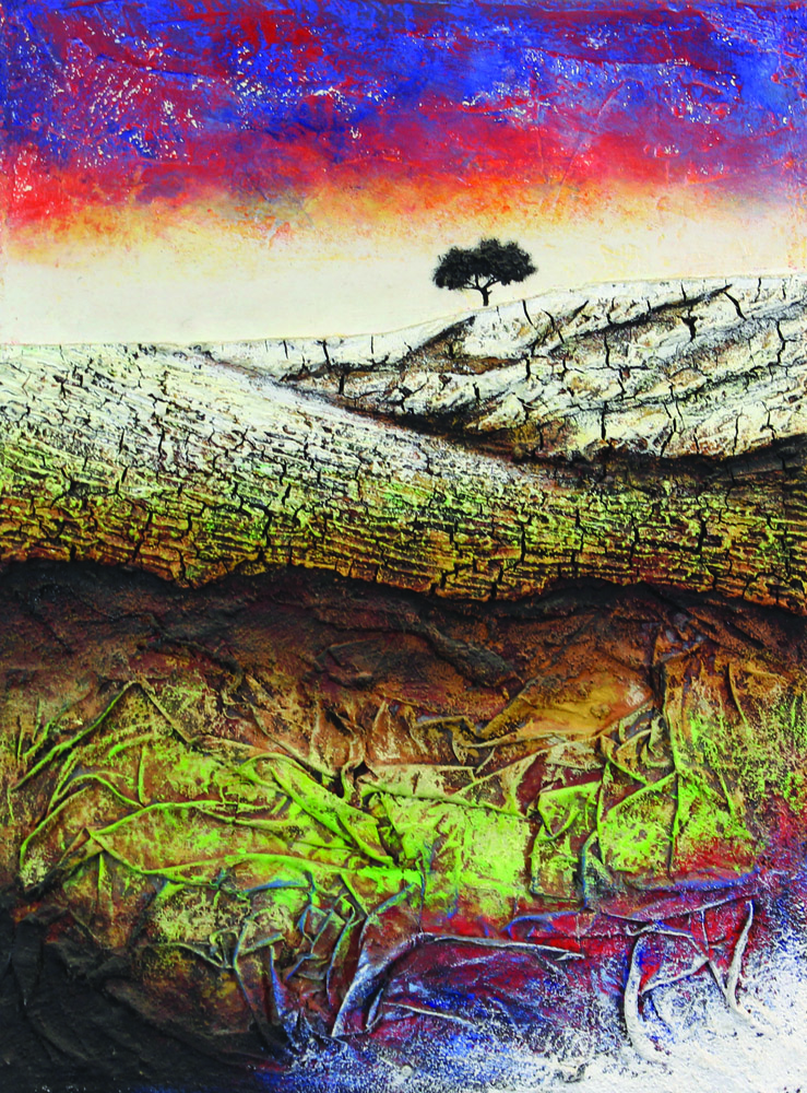 Mario Paschetta, Le Terre Coltivate Oltre la Città Perduta, 2005, tecnica mista su tela grezza, cm. 60x45, firmato, intitolato e datato al retro, certificato di archiviazione dell'artista su fotografia
