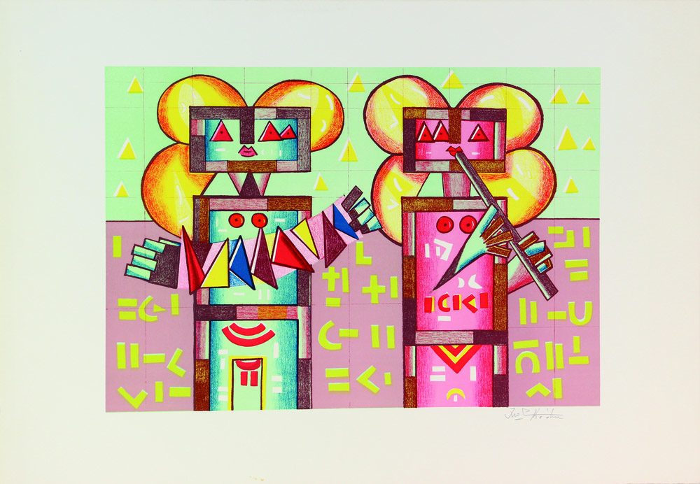 Ibrahim Kodra, Musicanti, (1980), litografia su carta, cm. 50x70, es. senza tiratura, firmata in basso a destra, Franco Sciardelli Editore, senza cornice