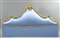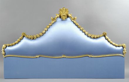 Testata di letto in legno intagliato e dorato, a profilatura sagomata, con pendaglie a foglie di acanto, rivestita in tessuto azzurro, cm. 97,5x171