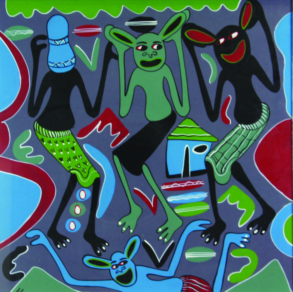 George Lilanga, Mbona Unajifi Sha, 1999, olio su tavola, cm. 61x61, firmato in basso a sinistra, intitolato e datato al retro, certificato di autenticità di Capt. Felix Lorenz