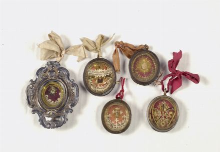 Cinque reliquiari a medaglione, montatura in metallo, di varie epoche e forme.