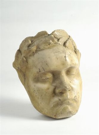 Maschera funebre di Beethoven coronato da alloro in cartapesta e gesso, cm. 24