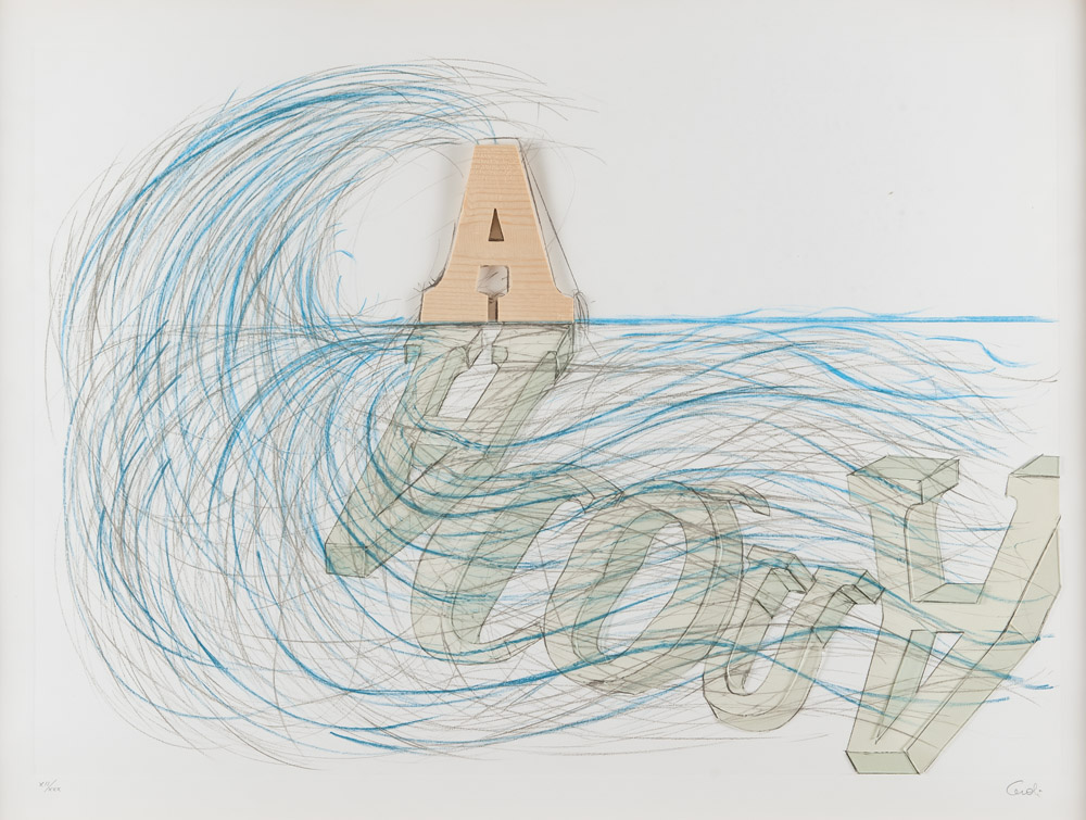 MARIO CEROLI (Castel Frentano 1938) Acqua Litografia a colori e collage, ex. XII/XXX Misure della lastra, cm. 50 x 70 Firma in basso a destra