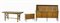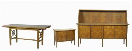 Credenza impiallacciata in noce a tasselli quadrati con alzata, quattro cassetti sul fronte e gambe dritte, cm. 135,5x190x58, un tavolo cm. 83x181,5x78,5 e un comodino cm. 84x105,5x43