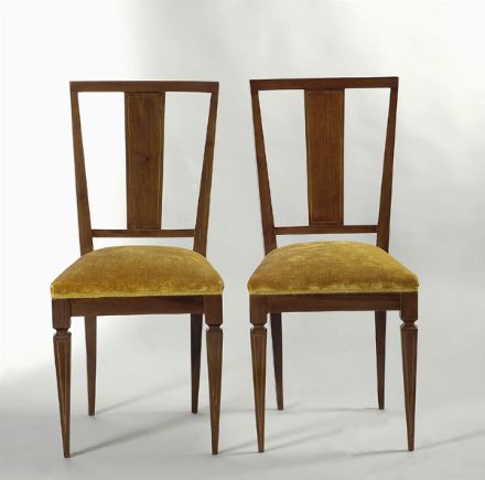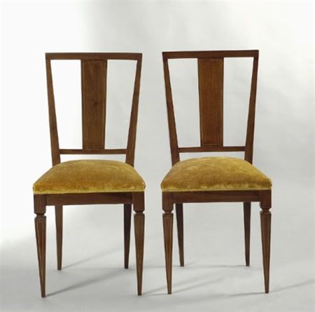 Coppia di sedie in noce schienale a trapezio con cartella filettata, piedi a...