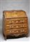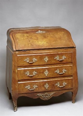 Ribalta in noce e radica di noce leggermente mosso sul fronte e sui fianchi a tre cassetti con filettature, borchie e maniglie in metallo sbalzato gonna mossa centrata da cartouches, scarabattolo interno a tre cassetti, pelle sul piano, gambe mosse. cm. 100x81x47
