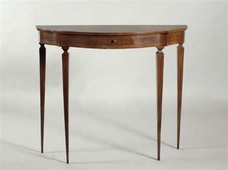 Consolle listrata in noce, piano sagomato, un cassetto sulla fascia, gambe a piramide, cm. 88x99x35