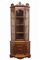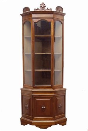Angoliera in mogano fronte trapezoidale uno sportello sformellato nella parte inferiore con presa a voluta, parte superiore a vetrina, cimasa sagomata a girali affiancata da due valve di conchiglia, piedi a mensola, XIX sec. cm. 238x90x62