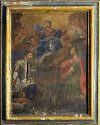 Apparizione della vergine a due santi, xviii sec. Olio su tela, cm. 60x50,5...