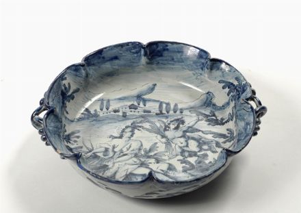 Centrotavola in ceramica blu Savona, decorata nel cavetto con Cerere e Amore marcato Cantagalli. (due prese laterali a spirali)