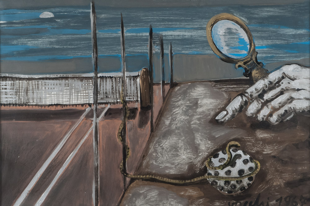 SERGIO VACCHI (Castenaso di Bologna 1925 - 2007) Il tennis di Galileo, 1967 Tecnica mista su tela, cm. 40 x 60 Firma e data in basso a destra Titolo, firma e data al retro