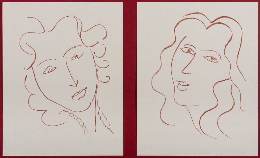 HENRI MATISSE (Cateau Cambrésis 1869 - Nice 1954) Portraits de femme, 1948 Coppia di stampe litografiche a tiratura limitata non firmate Misura dei fogli papier bouffant vergé, cm. 28 x 22 Stampatore Mourlot, Parigi Editore Skira, Parigi PUBBLICAZIONI Henri Matisse, Florilège des amours de Ronsard, Albert Skira, Parigi 1948