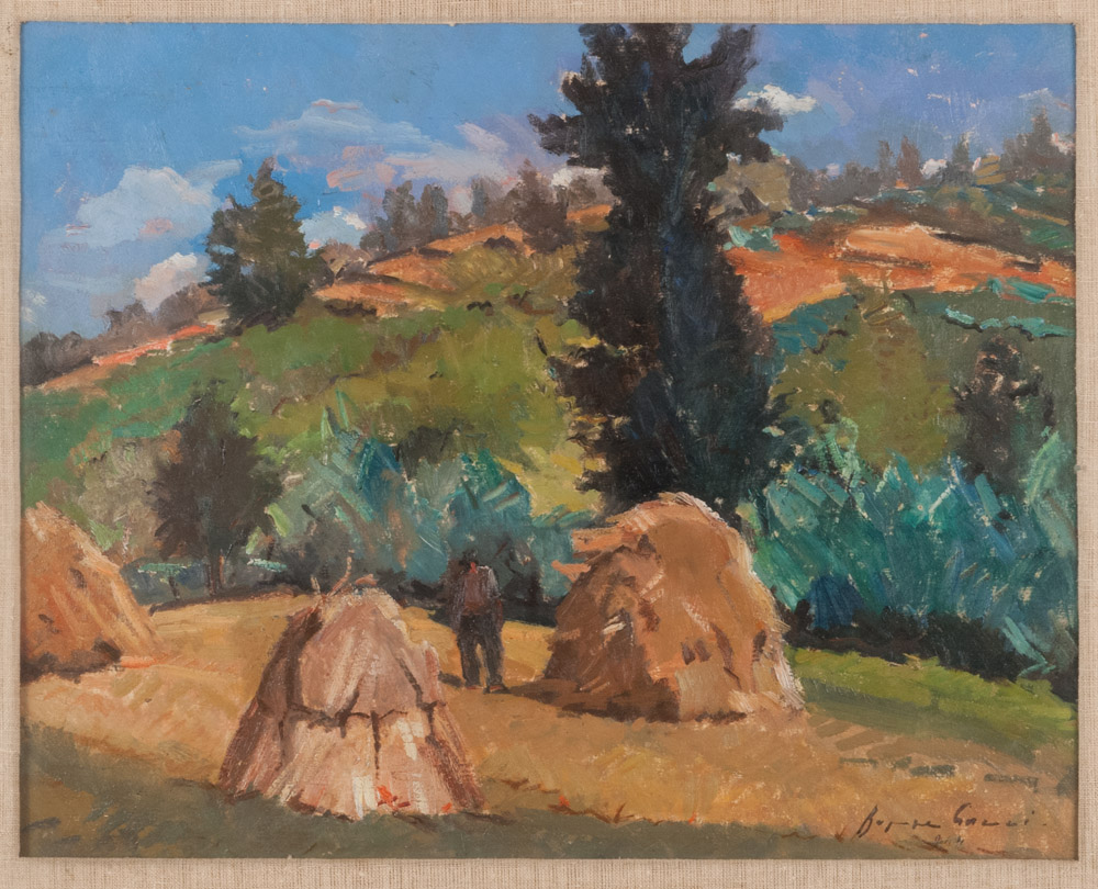 BEPPE GUZZI (Genova 1902 - Roma 1982) Covoni, 1944 Olio su tavoletta, cm....