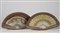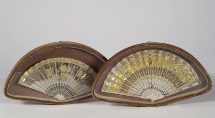 Due ventagli con pagine in seta e decori in ricamo a filo d’oro stecche in avorio dipinto e inciso, montati entro teche rivestite in velluto, XIX sec.
