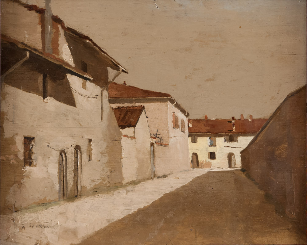 ALFREDO SORESSI (Mucinasso 1897 - Piacenza 1982) Case Olio su tavola, cm. 31 x 37 Firma in basso a sinistra