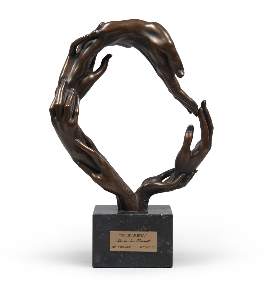 WOLFGANG ALEXANDER KOSSUTH (Pfronten 1947) Solidarietà Bronzo, ex 119/120 Misure, cm. 29 x 25 x 10 Firma in basso Base in marmo