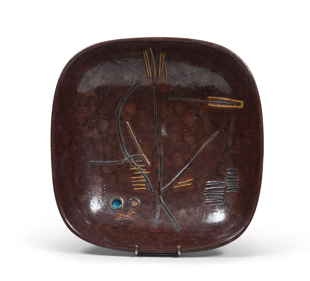 CONCA DI CARLO ZAULI (Faenza 1926 - 2002), ANNI '50 a sagoma quadrangolare in ceramica a smalti policromi e lustri metallici. Firma sotto la base. Misure cm. 9 x 31 x 31.