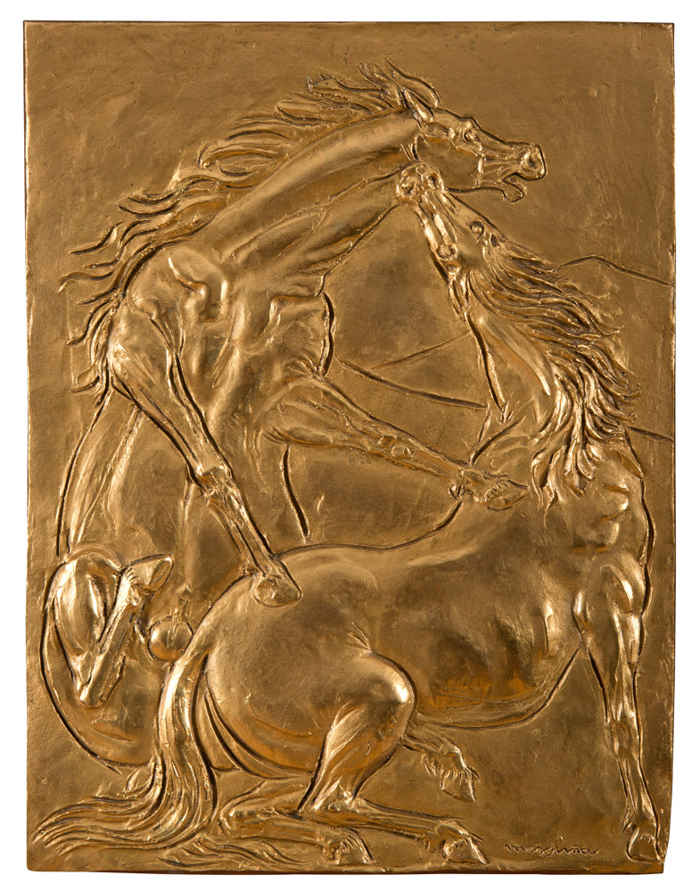FRANCESCO MESSINA (Linguaglossa 1900 - Milano 1995) Cavalli Bassorilievo in bronzo dorato, cm. 39 x 29 x 1,2 Firma incisa in basso a destra