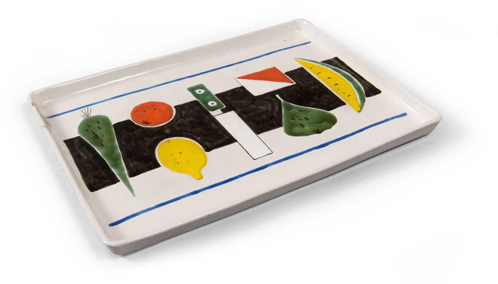 GUERRINO TRAMONTI (Faenza 1915 - 1992) Natura morta, 1962 Piatto in terracotta dipinta con smalti Misure, cm. 65 x 31,5 x 5 Firma sul fondo Rottura restaurata al bordo