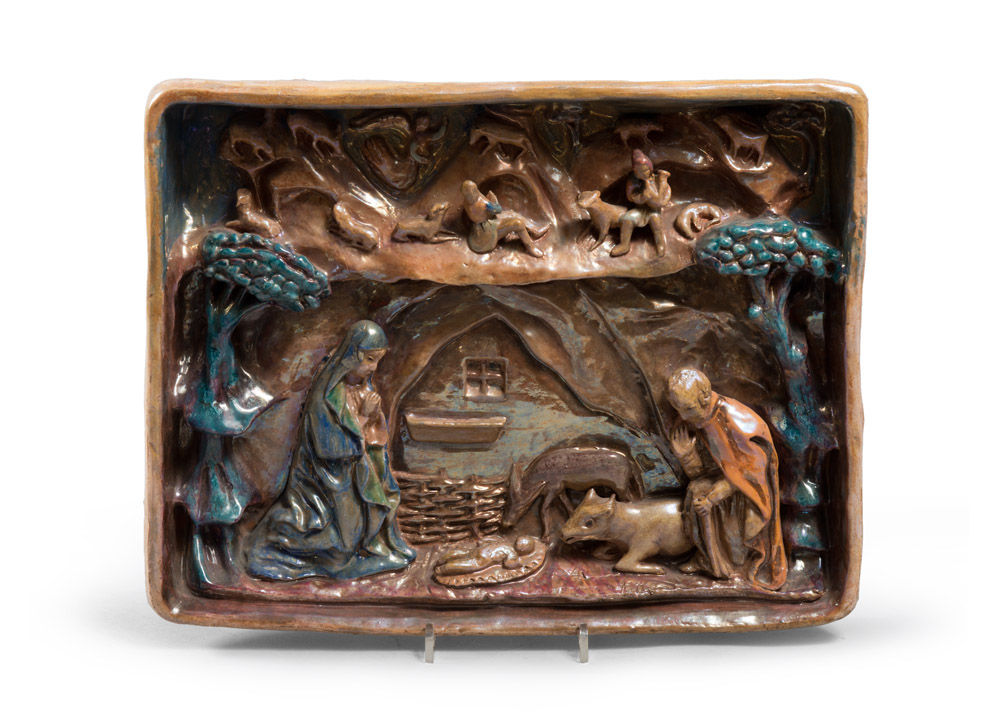 PIETRO MELANDRI (Faenza 1885 - 1976) Presepe, anni '70 Bassorilievo in ceramica policroma, 33,7 x 41,5 x 6 Firma in basso a destra sul bordo