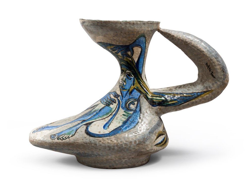 SALVATORE MELI (Comiso 1929 - Roma 2011) Grande versatoio, 1956 Ceramica a smalti policromi con grande ansa, con due figure maschile e femminile Misure cm. 43,5 x 65 x 27 Firma e data sul manico Attaccatura del manico rincollata