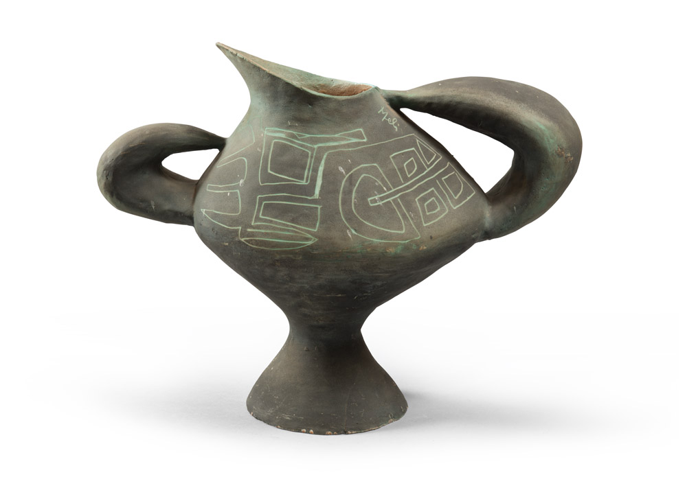 SALVATORE MELI (Comiso 1929 - Roma 2011) Brocca, anni '50 Ceramica a smalto verde con grandi anse laterali e decori geometrici incisi Misure cm. 34 x 47 x 20 Firma incisa sul collo Filatura sulla base