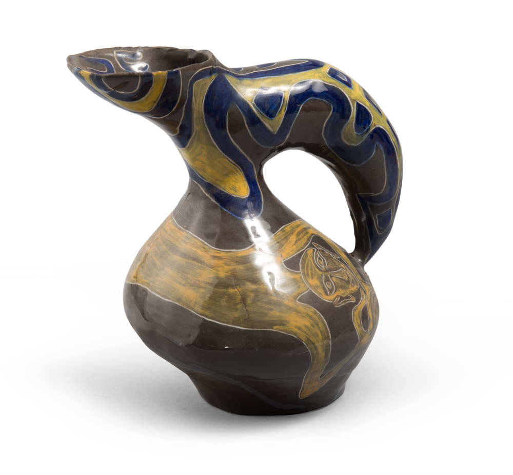 SALVATORE MELI (Comiso 1929 - Roma 2011) Piccolo versatoio, 1953 Ceramica a smalti policromi con grande ansa, figura maschile e decori astratto-geometrici dipinti Misure cm. 21 x 20 x 15 Firma e data sotto il manico
