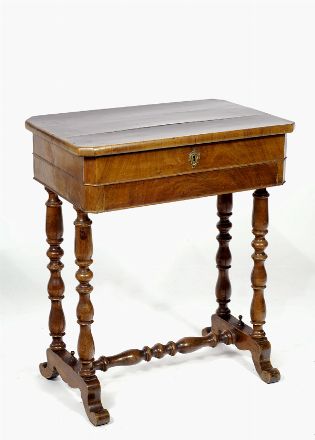 Tavolino da lavoro in noce, piano ribaltabile con angoli scantonati, vani e specchio interni, un cassetto sulla fascia, gambe tornite riunite da traversa, piedi a ricciolo, XIX sec., cm. 70x42x57