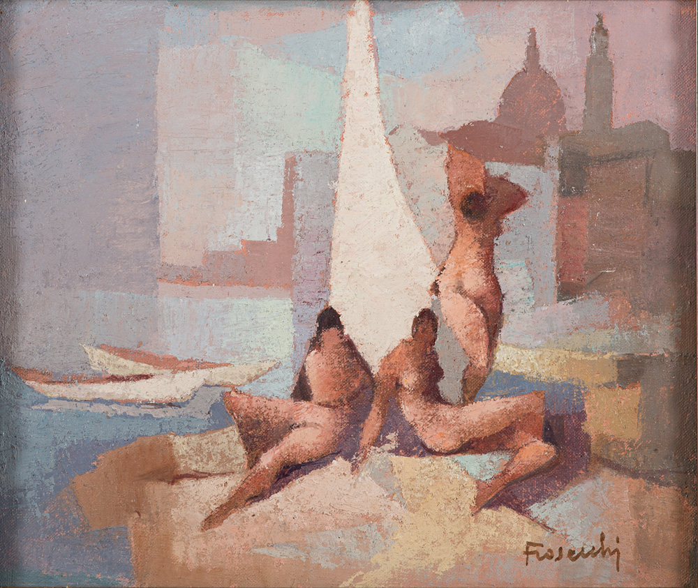 PAOLO FROSECCHI (Firenze 1924) Bagnanti, 1983 Olio su tela, cm. 25 x 30 Firma in basso a destra Firma e data al retro Timbro al retro