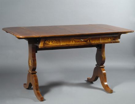 Tavolo scrittoio a bandelle listrato in noce, un cassetto sulla fascia, gambe a lira, cm. 74x139x78.
