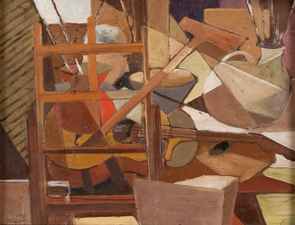 BRUNO ORLANDI (Trepuzzi 1934 - Udine 1958) Composizione, 1957 Olio su tavola, cm. 34,5 x 44,5 Firma e data in basso a sinistra