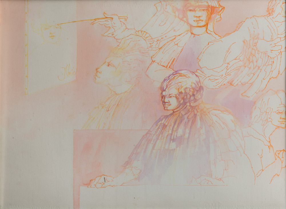 FABRIZIO CLERICI (Milano 1913 - Roma 1993) Tribunale, 1982 ca. Penna e acquarello su carta, cm. 55 x 76 Firma al centro Autentica su foto dell'Archivio Clerici, Roma