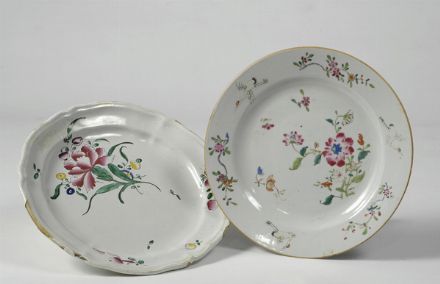 Coppia di piatti in porcellana dipinta, di diversa forma e decorazione, Compagnia delle Indie, XVIII-XIX sec.