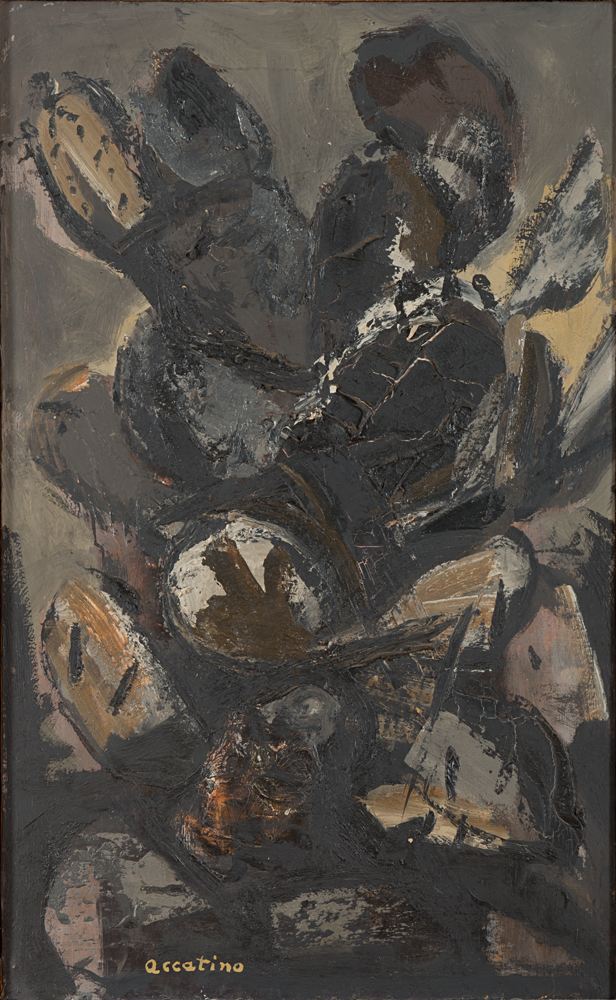 ENRICO ACCATINO (Genova 1920 - Roma 2007) Fichi d'india, anni '50 Olio su tela, cm. 77 x 48 Firma in basso a sinistra Titolo al retro