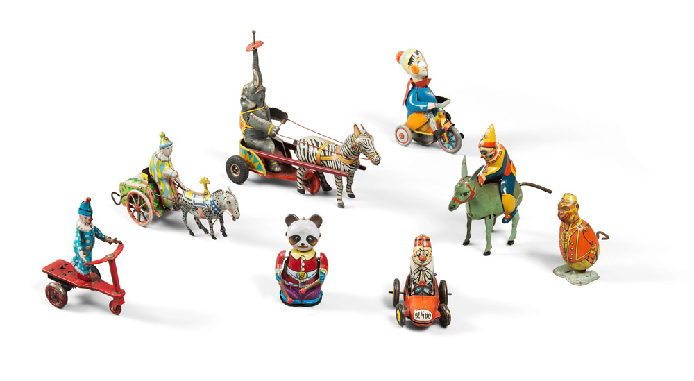 GRUPPO DI OTTO GIOCATTOLI D'EPOCA composto da personaggi del circo in latta e ferro verniciati, alcuni con chiave a molla Misure varie Marchi vari: D.R.G.M, Made in Germany - Lima, Made in Italy - Joustra, Made in France - Made in U.S. Zone Germany