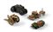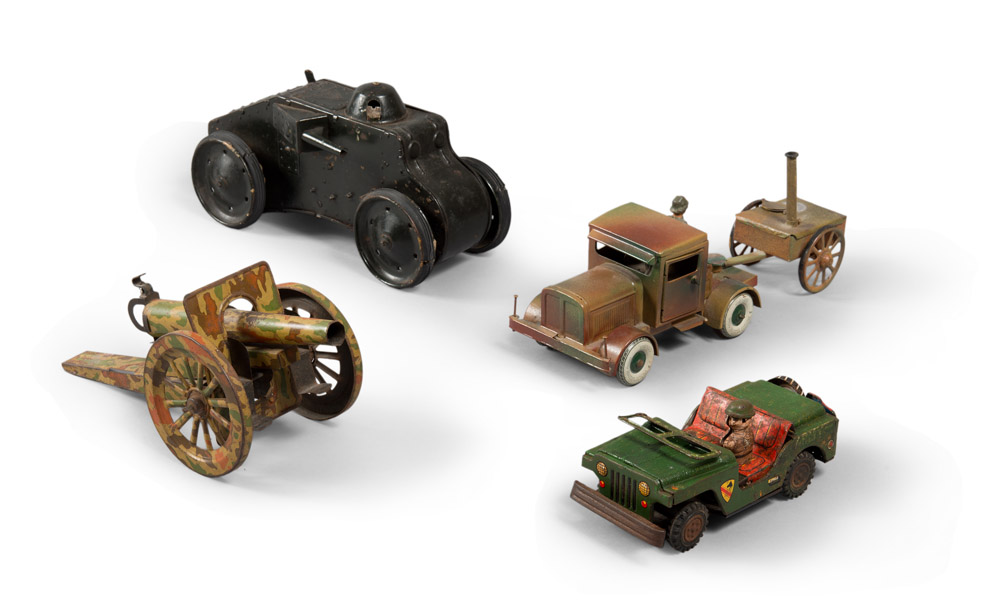 GRUPPO DI QUATTRO GIOCATTOLI D'EPOCA composto da modellini di carri militari in latta e ferro verniciati Misure varie Marchi vari: Tri-ang, Made in England - Ingap, Padova