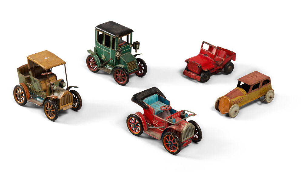 GRUPPO DI CINQUE GIOCATTOLI D'EPOCA composto da modellini di automobili in latta e ferro verniciati, alcuni con chiave a molla Misure varie Marchi vari: Made in Japan - Made in France